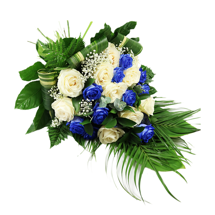 Convey your deepest sympathies with our Elegant White and Blue Rose Spray, meticulously designed to offer solace and beauty. This stunning arrangement includes: